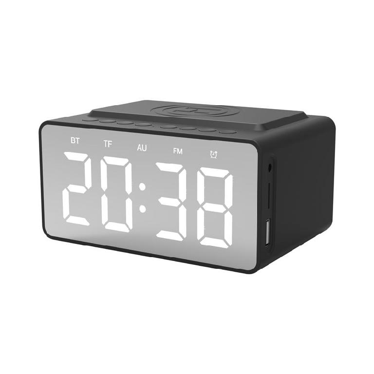 The feature-packed Dover alarm clock Bluetooth speaker brings together a 10 Watt wireless charger, large LED mirror display, built-in FM Radio, auxiliary input, TF input, high-definition microphone and one USB charging port into one versatile device for the home or office. With Foreign Object Detection and temperature control circuitry the Dover is compatible with any device meeting the Qi wireless charging standard (i.e. iPhone 11, Samsung S10). Includes a Type-C charge cable and user manual. Material: ABS.