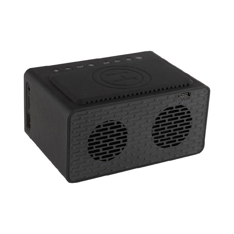 The feature-packed Dover alarm clock Bluetooth speaker brings together a 10 Watt wireless charger, large LED mirror display, built-in FM Radio, auxiliary input, TF input, high-definition microphone and one USB charging port into one versatile device for the home or office. With Foreign Object Detection and temperature control circuitry the Dover is compatible with any device meeting the Qi wireless charging standard (i.e. iPhone 11, Samsung S10). Includes a Type-C charge cable and user manual. Material: ABS.