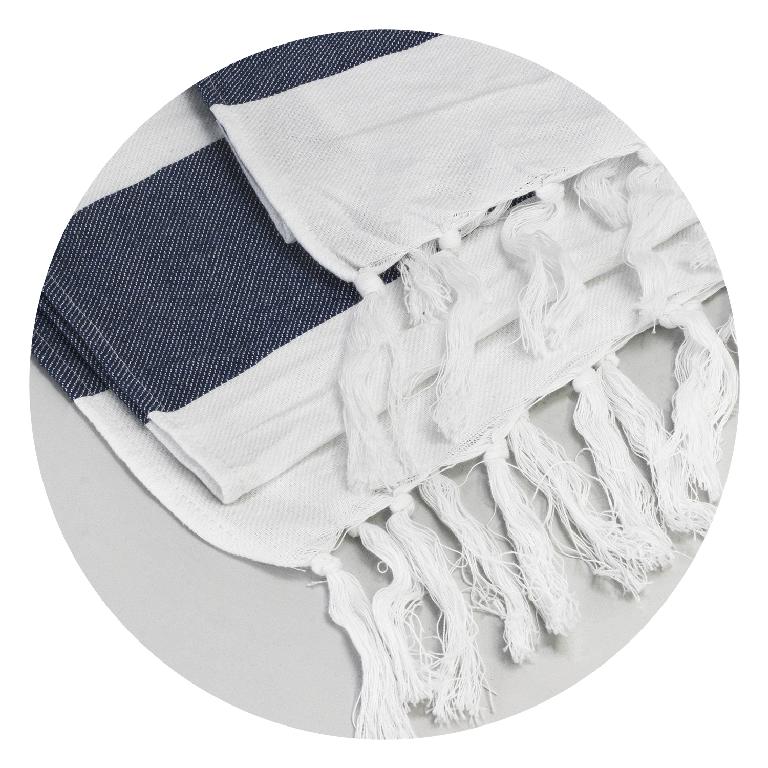 Beach inspired cotton towel manufactured from 200gsm 100% Cotton. It features a rustic style weave with stripes and a fringed trim.